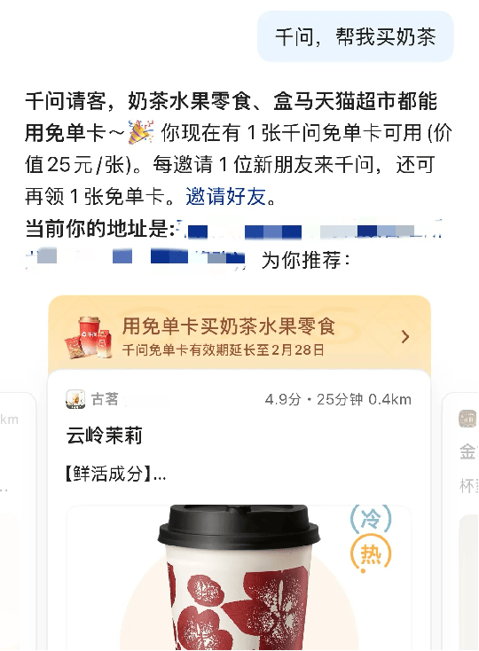 “春节30亿大免单”活动启动不到3小时,超100万杯奶茶通过一句语音指令被订购,巨大的流量甚至让千问App系统一度“开小差”。短短九小时内,订单量更是突破1000万单。